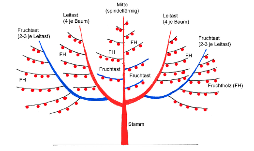An den drei bis vier steilen Leitästen werden balkon- bzw. fächermäßig Fruchtäste nach außen gezogen. So wird der Baum breit und bleibt trotzdem stabil. Die meisten Früchte wachsen selbst bei älteren Bäumen im unteren Kronenbereich und an der Mitte.